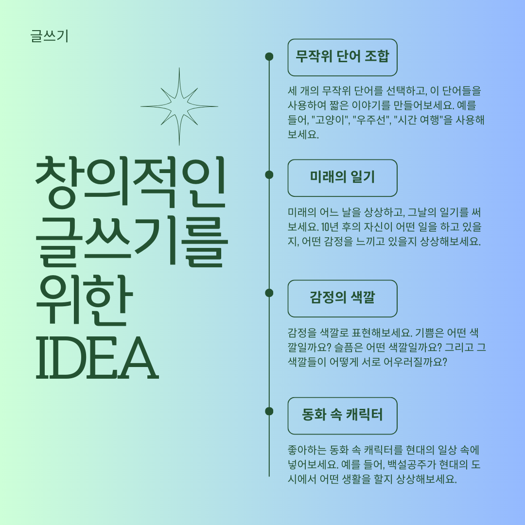 여러분, 안녕하세요! 오늘은 우리 모두의 고민거리인 '창의적인 글쓰기'에 대해 이야기해보려고 해요. "창의적인 글 잘 쓰고 싶은데, 어떻게 써야 할지 막막할 때가 많아요." 이 말에 공감하시나요? 저도 그랬어요. 하얀 화면 앞에서 멍하니 앉아있던 적이 한두 번이 아니죠. 하지만 걱정 마세요! 오늘 우리 함께 이 벽을 넘어가 봐요. 창의적인 글쓰기를 시작하기 위한 브레인스토밍을 시작해볼까요? 여러분의 숨겨진 창의력을 깨우는 특별한 방법들을 소개해드릴게요. 글쓰기가 더 이상 두렵지 않고, 즐거운 여정이 될 수 있도록 함께 시작해볼까요? 창의적인 글쓰기의 세계로 함께 떠나봐요!