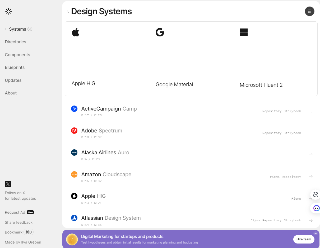 디자인 UI/UX 레퍼런스 참고 사이트 Adobe Spectrum, Apple HIG, Google Material Design 등 유명 디자인 시스템은 물론 60개가 넘는 디렉토리, 24개의 컴포넌트, 55개의 블루프린트도 확인하실 수 있어요.각종 컴포넌트 참조, 가이드라인, 기술 문서들을 통해 다양한 디자인 시스템을 비교, 연구하는 데 큰 도움이 됩니다.또 특정 컴포넌트나 가이드라인을 찾으실 때에도 유용한 리소스가 될 거에요. 지금 바로 확인해 보세요. 바로가기> Design Systems Database: Surf among top‑notch Design SystemsBest-in-class Design Systems with components and foundations reference..
